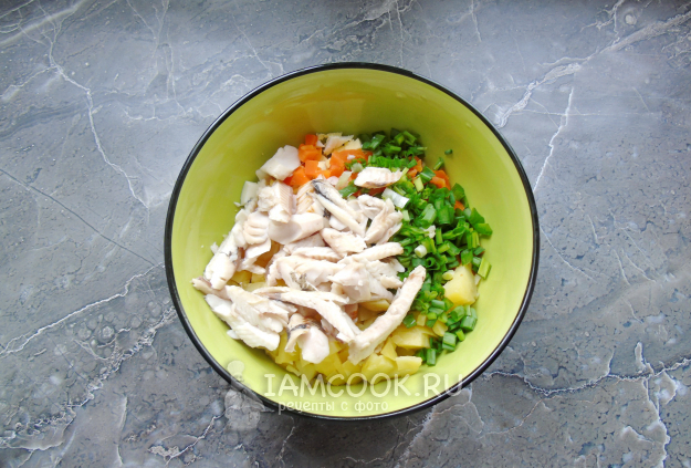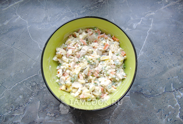 Посолите, поперчите и перемешайте все ингредиенты салата.