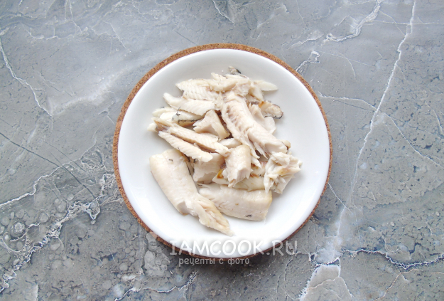 Хека помойте и выложите в кастрюлю. Залейте водой и немного посолите. Доведите до кипения. Варите 10-12 минут. После достаньте из кастрюли, охладите и удалите хребет.