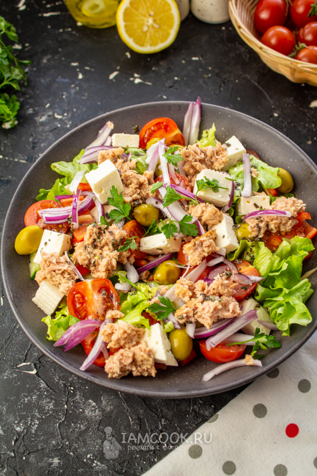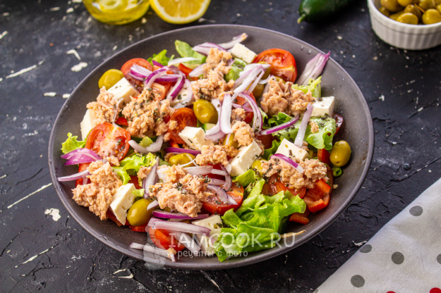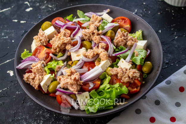 Греческий салат с тунцом готов! Подавайте его сразу. Приятного аппетита!!!