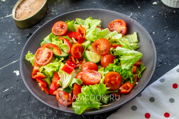 В салатник нарежьте или порвите руками салат, добавьте нарезанные помидоры и огурцы. Сладкий перец очистите от семян, нарежьте кусочками и тоже отправьте в салатник.