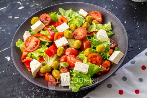 Сыр "Фета" нарежьте на кубики, добавьте в салат вместе с оливками.