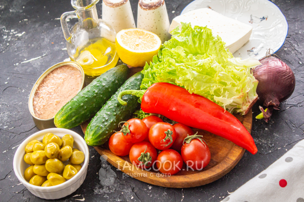 Все необходимые продукты для Греческого салата с тунцом - перед вами. Овощи и салат промойте и обсушите.