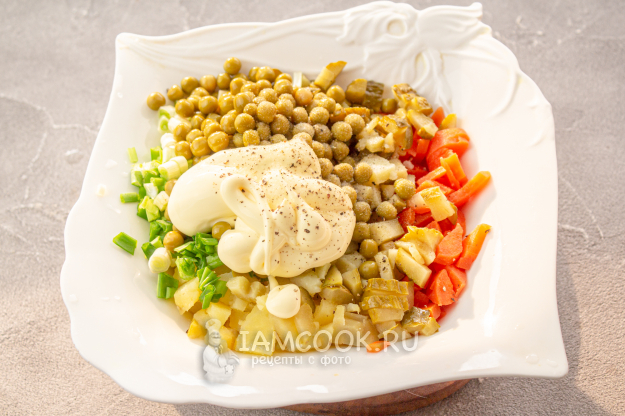 Добавьте постный майонез, соль и черный молотый перец и перемешайте салат.