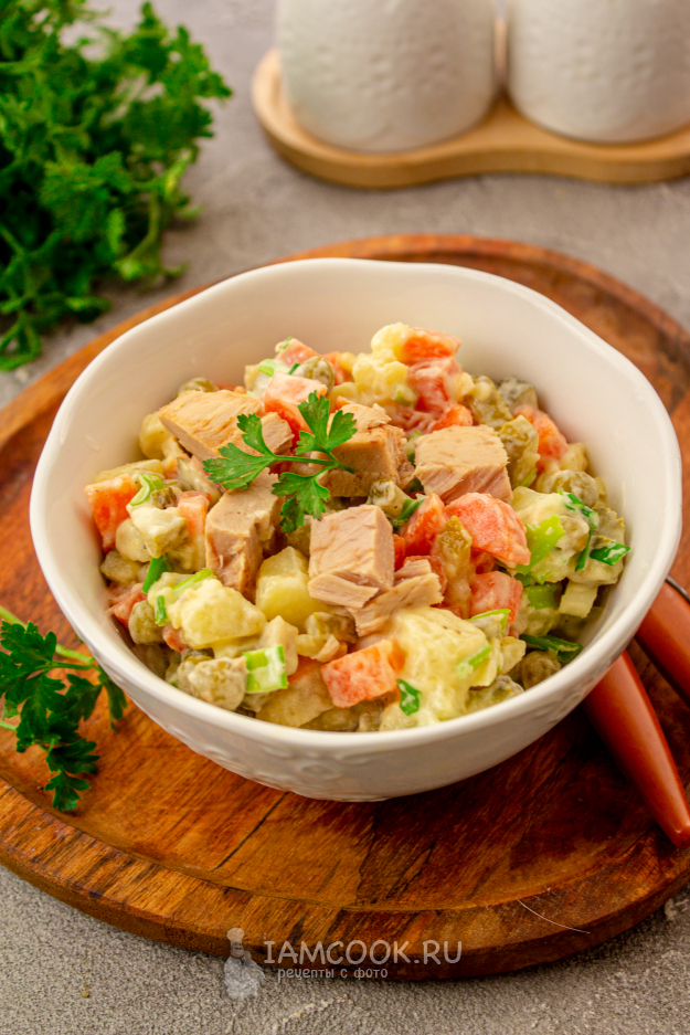 Консервированного тунца выложите в порционные мисочки при подаче. Так мне нравится больше, чем смешивать его в общем салатнике с остальными ингредиентами. На стол постный салат Оливье с тунцом подавайте сразу. Приятного аппетита!!!