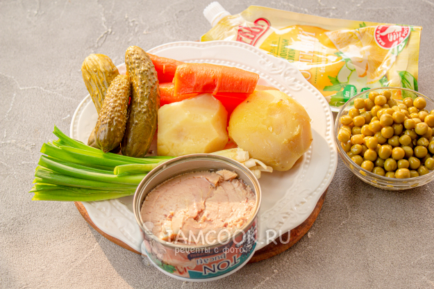 Все необходимые продукты для постного салата Оливье с тунцом (консервированным) - перед вами. Овощи предварительно отварите и очистите.