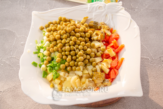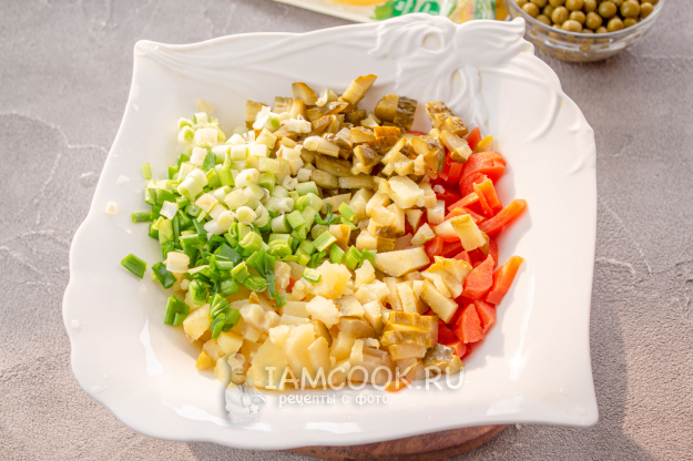 Как и в классическом варианте, отварные овощи, соленые огурцы нарежьте небольшим кубиком, сложите в салатник, добавьте мелко нарезанный зеленый лук - он придаст свежесть салату.