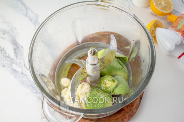 Спелое авокадо очистите от кожуры, удалите косточку. Для приготовления соуса, авокадо, майонез, чеснок и сок лимона поместите в чашу блендера.