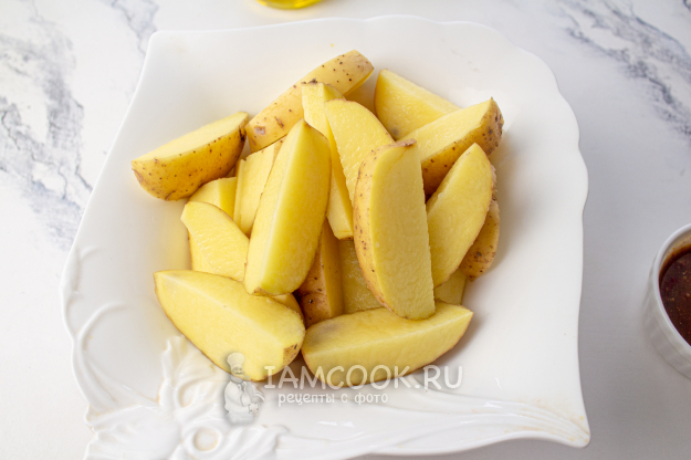 Картофель хорошо промойте, обсушите и нарежьте дольками.