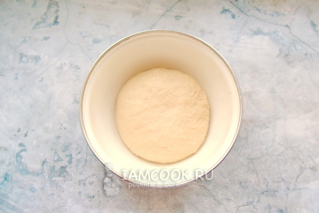 Замесите достаточно крутое, но мягкое и эластичное тесто, не липнущее к рукам. Дно миски смажьте подсолнечным маслом и выложите тесто. Накройте пищевой пленкой или полотенцем. Поставьте в теплое место.