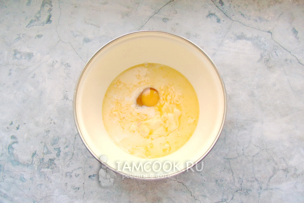 Налейте теплое молоко. Добавьте яйцо, сахар и ванильный сахар. Сливочное масло или хорошего качества маргарин растопите, немного охладите и тоже добавьте в миску.