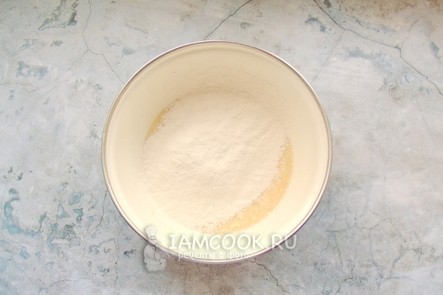 Насыпьте соль и постепенно добавляйте просеянную муку.