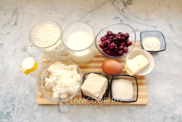 Соберите ингредиенты для приготовления рулета с творогом и вишней в духовке.