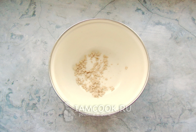 Приготовление начните с теста. В миску раскрошите дрожжи.