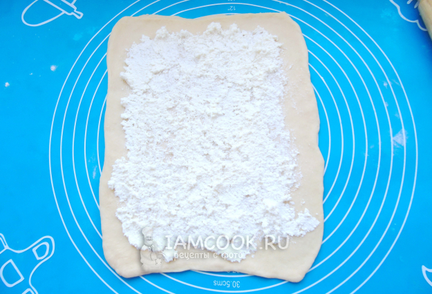 Подошедшее тесто достаньте из миски, обомните. Разделите на две части. Раскатайте одну часть в прямоугольный пласт. Выложите на него творожную начинку.