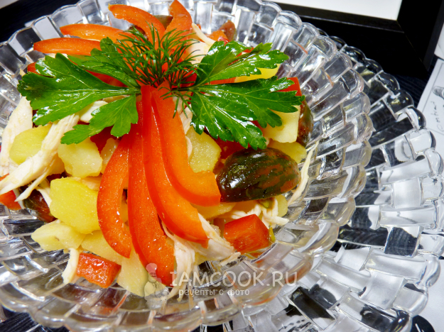Грудку и картофель отварила на пару. Охлажденные картофель и грудку нарезала, добавила к ним болгарский перец, помидоры, колотый пармезан. Смешала оливковое масло с лимонным соком, добавила соль, перец и заправила салат.