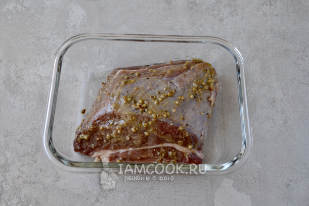 Кусок говядины вымойте, обсушите бумажным полотенцем и натрите со всех сторон маринадом. Контейнер закройте и поставьте в холодильник на 3-5 часов. Если позволяет время, то говядину можно мариновать всю ночь.