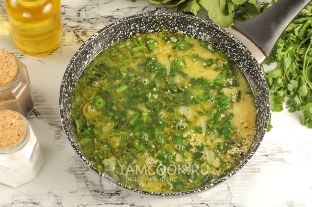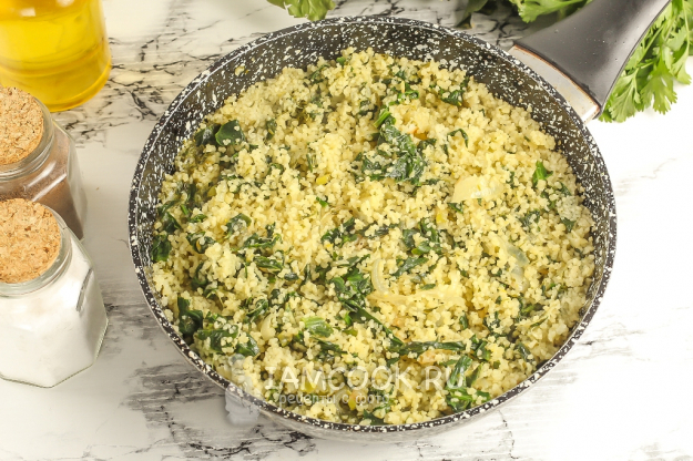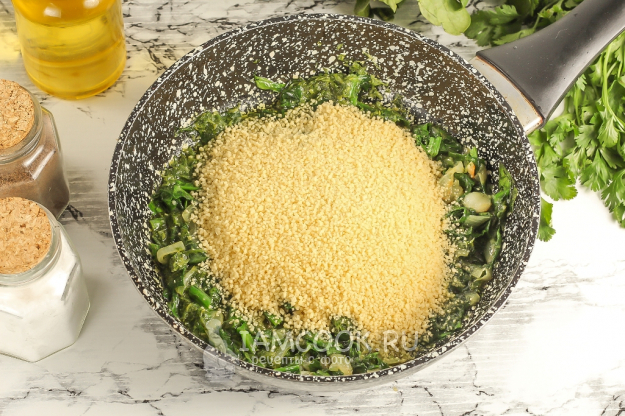 Когда шпинат потушится, всыпьте кускус.