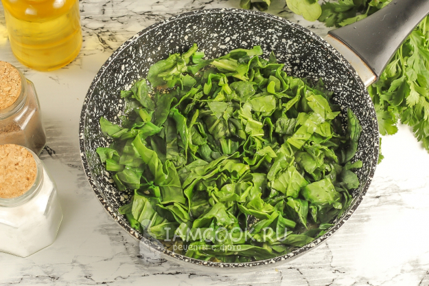 В это время промойте листья шпината, срежьте стебли. Нарежьте шпинат лентами и добавьте на сковороду. Сразу же всыпьте соль. Можно добавить и другие приправы, пряности по вкусу. Перемешайте шпинат и готовьте примерно 2-3 минуты. За это время масса зелени станет раза в три меньше.