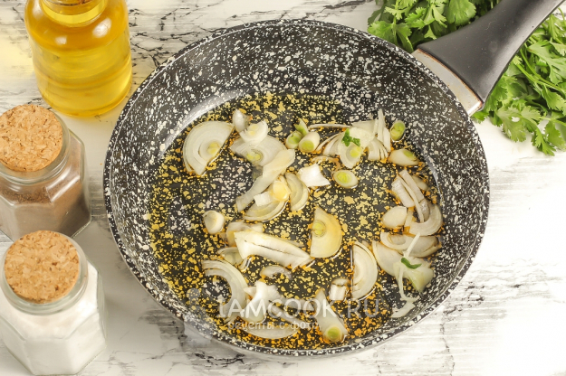 Лук очистите от шелухи и промойте в воде, нарежьте полукольцами. Прогрейте растительное масло на сковороде и обжарьте в нем луковую нарезку примерно 3-5 минут, до румяности.