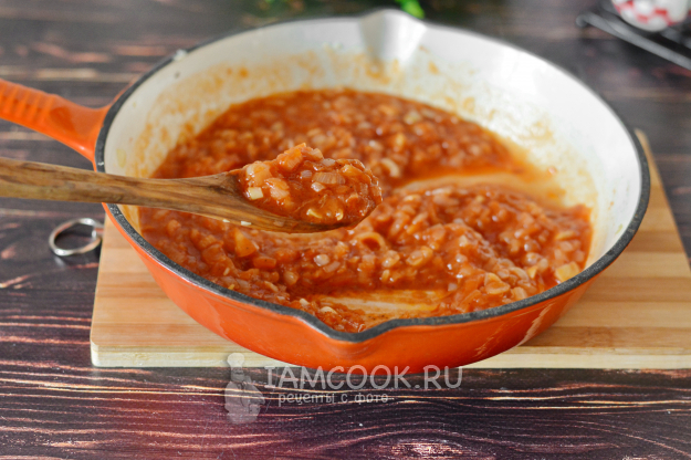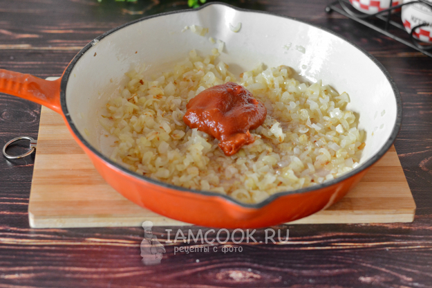 Разогрейте в сковороде достаточное количество масла, и обжарьте лук до хорошего золотистого цвета. После чего добавьте томатную пасту и обжаривайте её с луком около 1 минуты.