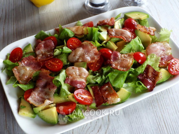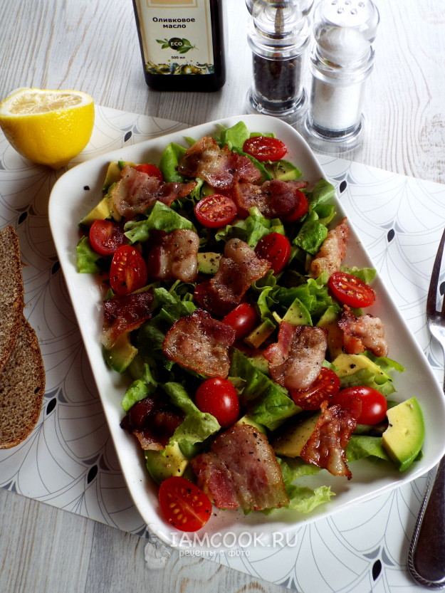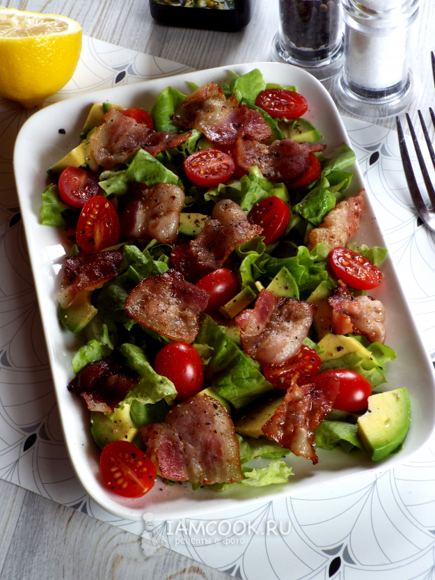 Салат с авокадо и беконом надо сбрызнуть лимонным соком, слегка подсолить и поперчить.