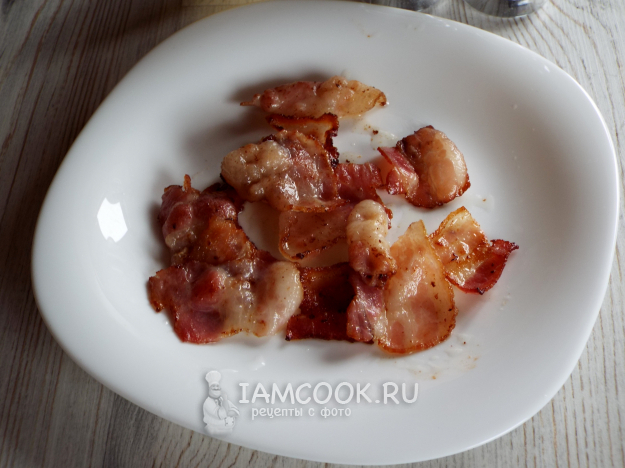 Бекон нарезать и поджарить до румяного состояния.