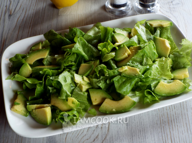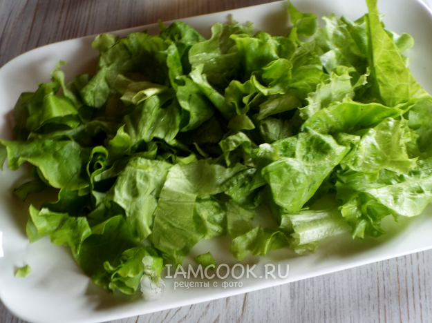 Листья салата нарезать или нарвать руками и выложить на тарелку.