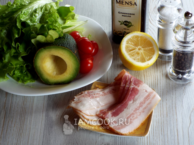 Вот такой набор продуктов нам нужен, чтобы сделать салат с авокадо и беконом.