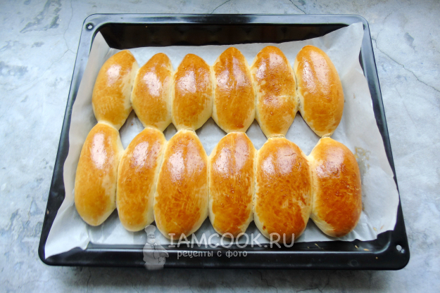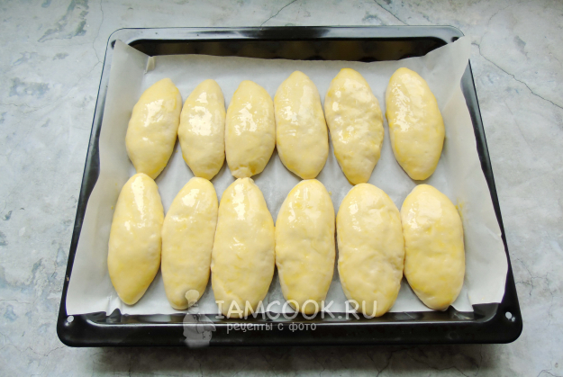 Заготовки пирожков выложите на противень. Накройте пищевой пленкой и дайте постоять 25-30 минут при комнатной температуре. После смажьте яйцом.