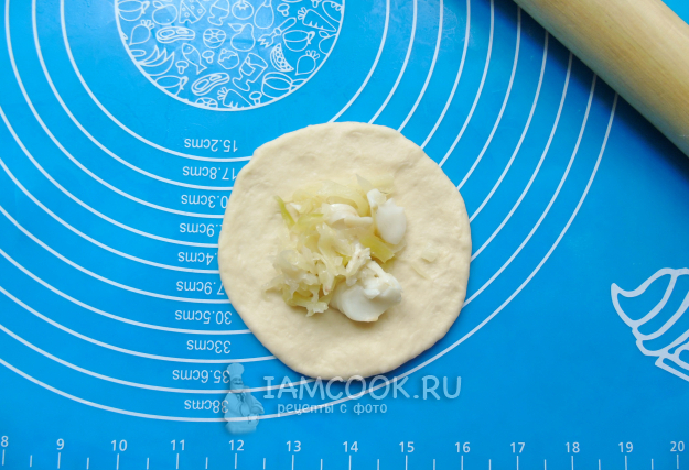 Каждый шарик раскатайте в лепешку, в середину которой выложите начинку.