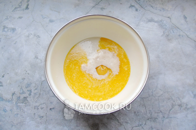Сливочное масло или маргарин растопите, немного охладите и налейте в миску. Добавьте яйцо и перемешайте.