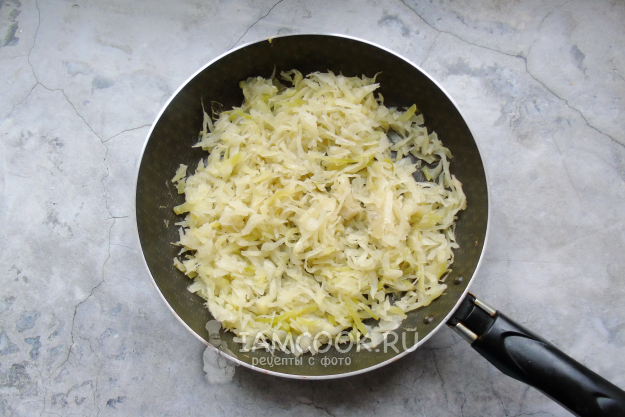 А пока тесто подходит, приготовьте начинку. Репчатый лук мелко нарежьте. Капусту нашинкуйте и выложите с луком на сковороду с подсолнечным маслом. Налейте 50 мл воды, посолите по вкусу. Накройте сковороду крышкой и тушите капусту с луком на огне чуть ниже среднего до готовности, периодически перемешивая.