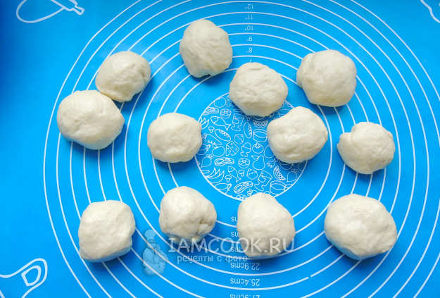 Достаньте тесто из миски, обомните и разделите на шарики весом приблизительно 50-60 граммов. Если есть кулинарные весы и желание, то можно взвесить. Когда я пеку пирожки для гостей, то делаю их одинаковыми, но в кругу семьи отлично едят и так.