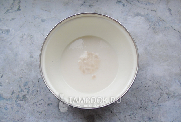 Приготовьте тесто для пирожков. В миску накрошите свежие дрожжи. Налейте теплое молоко и насыпьте сахар, перемешайте.
