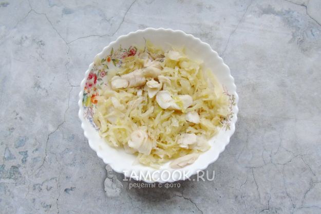 Хека помойте и выложите в кастрюлю с водой. Немного посолите, доведите до кипения и варите на небольшом огне 8-10 минут. Время варки зависит от размера рыбы. После хека охладите, удалите хребет и шкурку. Разберите рыбу на небольшие кусочки и добавьте в капусту, перемешайте.