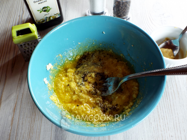Желтки растереть с натёртым на мелкой тёрке чесноком.