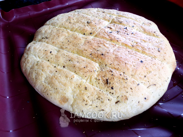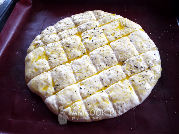 Спустя 10 минут, когда лепёшка поднимется, сделать пальцем или деревянной палочкой полоски, смазать маслом и посыпать травами.