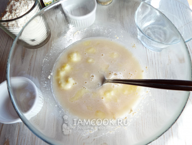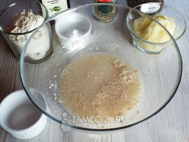 В тёплой воде развести дрожжи и сахар. Оставить на 10 минут.