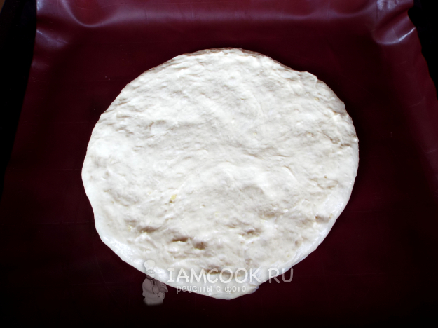 Смазать руки маслом и выложить тесто на противень с бумагой или ковриком. Сформировать тонкую лепешку.