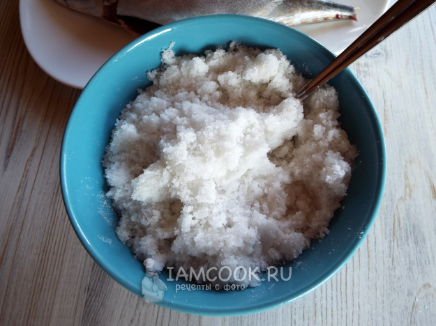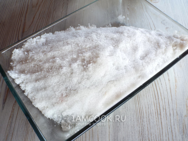В форму или на противень выложить половину соли. Разложить рыбу.