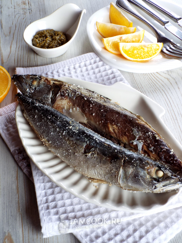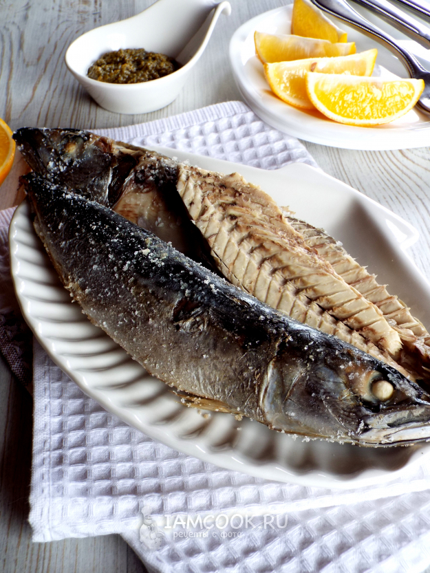 Скумбрия, запечённая на соли в духовке, готова к подаче на стол.