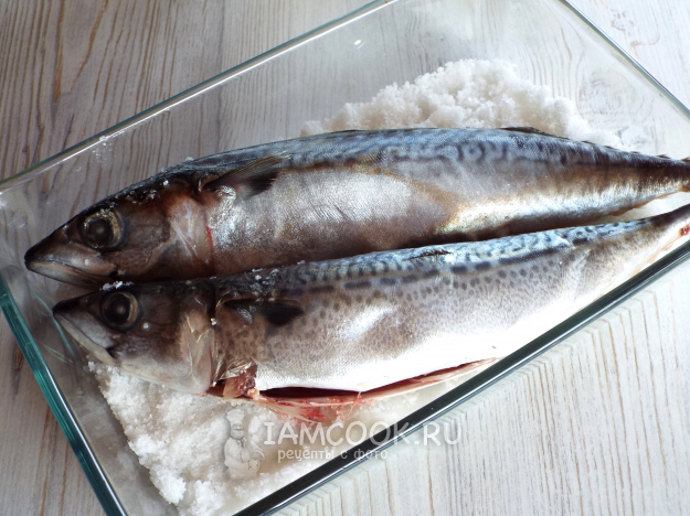 Скумбрия, запечённая на соли в духовке, готовится из свежей рыбы, очищенной от внутренностей.