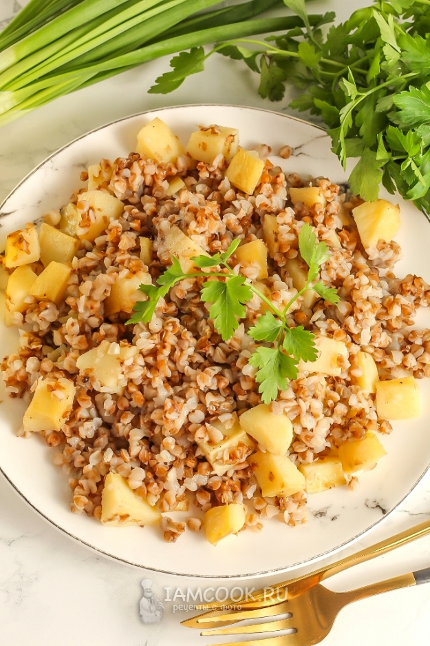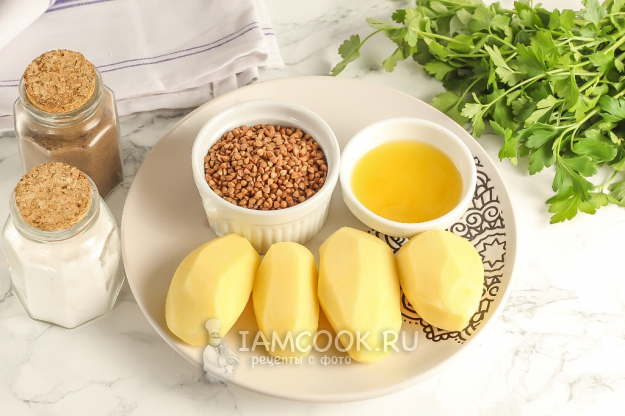 Продукты для приготовления гречки с картошкой в духовке - перед вами!