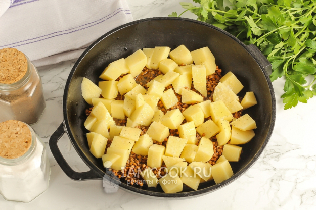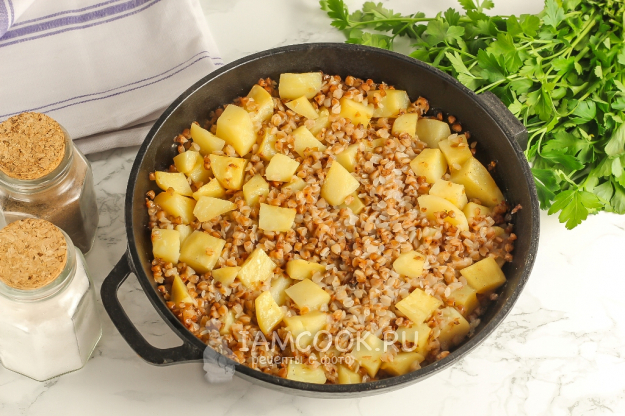 Разогрейте духовку до 180 градусов и влейте в форму горячую воду. Поместите форму с гречкой и картошкой в духовку на 20 минут. В середине запекания перемешайте всю массу, чтобы верхние зерна не остались непропитанными.