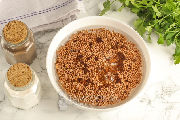 Гречку переберите, удалите подгоревшие зерна. Затем промойте крупу в воде.