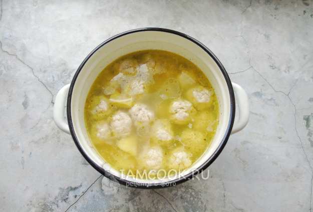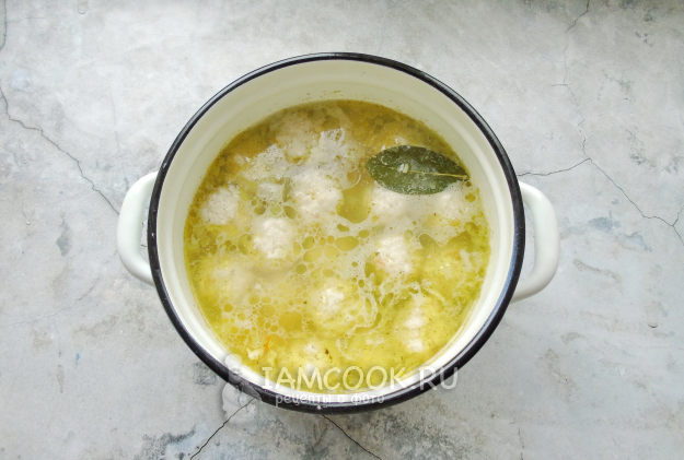 Через 15-20 минут добавьте фрикадельки. Посолите и поперчите суп, выложите лавровый лист.