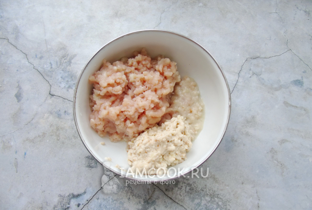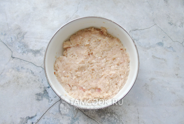 Приготовьте фарш для фрикаделек. Куриное филе, половину луковицы и батон, заранее замоченный в холодной кипяченой воде, а потом отжатый, пропустите через мясорубку.