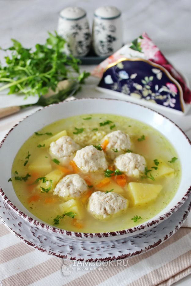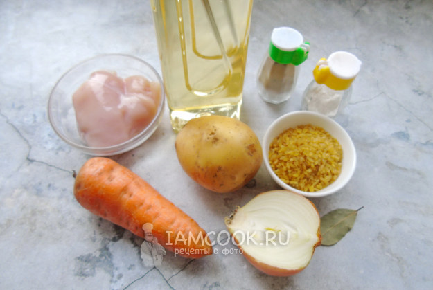 Возьмите ингредиенты для приготовления супа с булгуром и фрикадельками, показанные на фото.