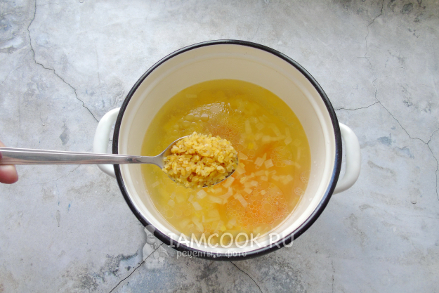 Доведите содержимое кастрюли до кипения и насыпьте булгур.