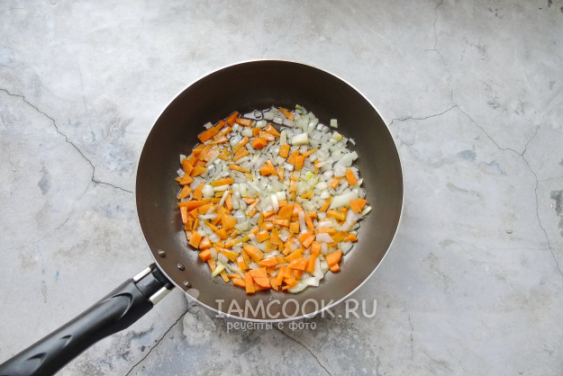 Лук и морковь мелко нарежьте. Выложите на сковороду, налейте подсолнечное масло и пассеруйте до прозрачности лука.